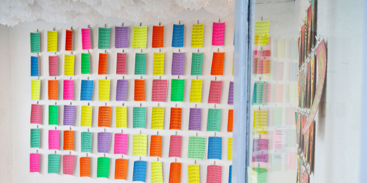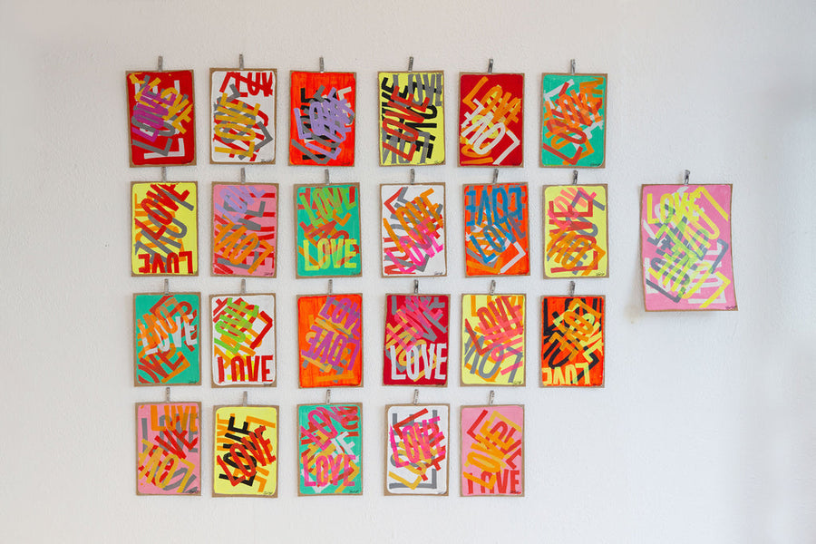 Celebrate your love with a pop sensibility in Toby’s distinctive school detention lines drawing on brightly painted paper.