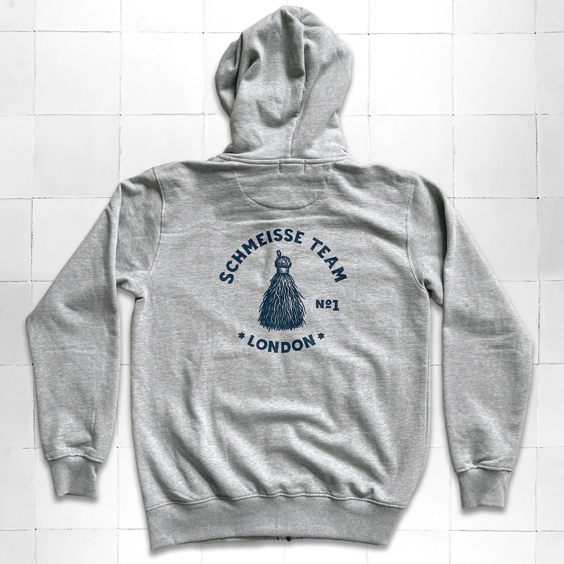Unisex zip-up hoodie in light heather grey, featuring the TBHS monogram logo on the front and the No.1 Schmeisse Team London logo on the back in navy blue. Made from 100% organic cotton, with a soft brushed 3-ply French Terry finish. Contemporary fit, durable, and sustainably produced.