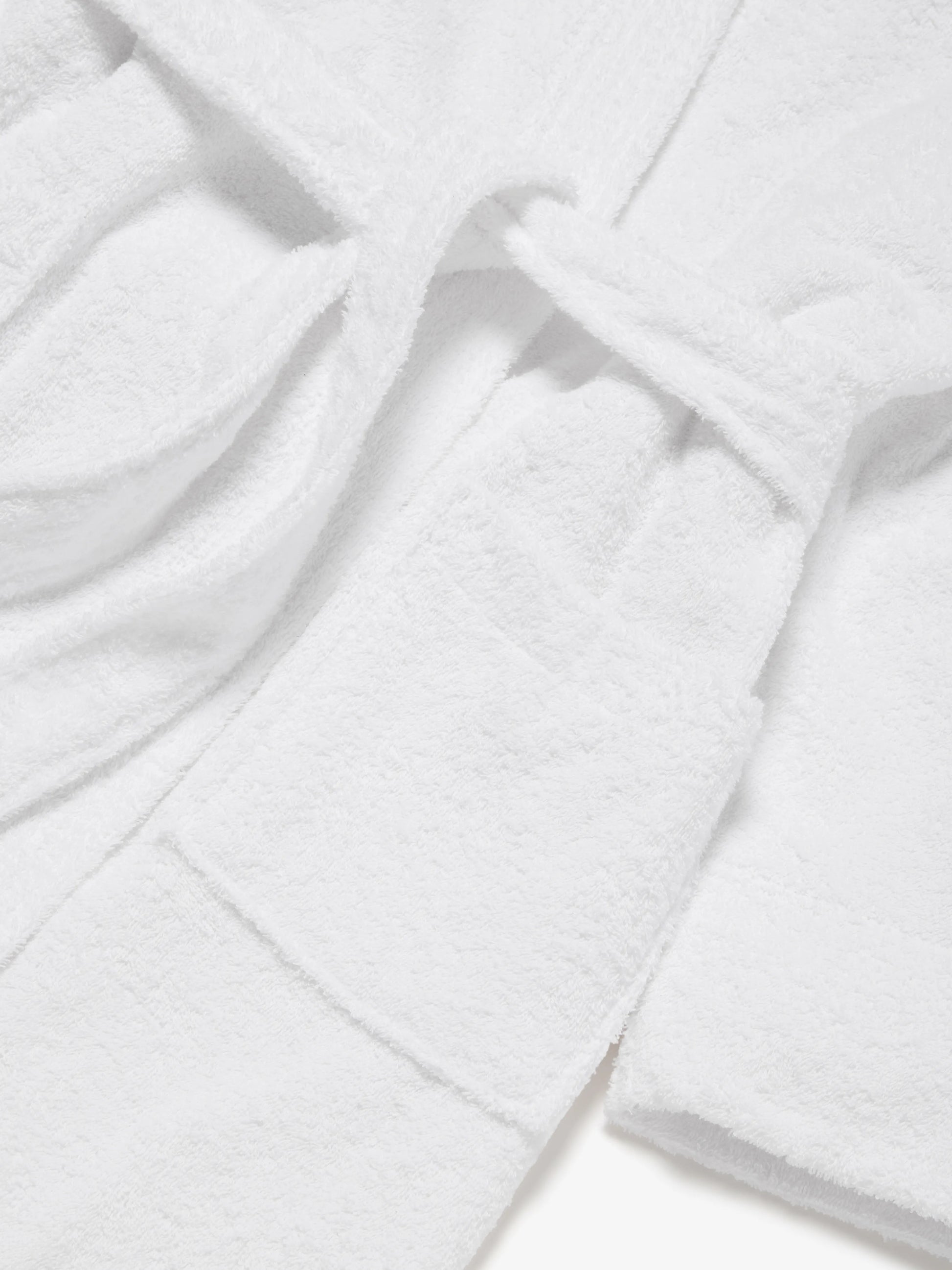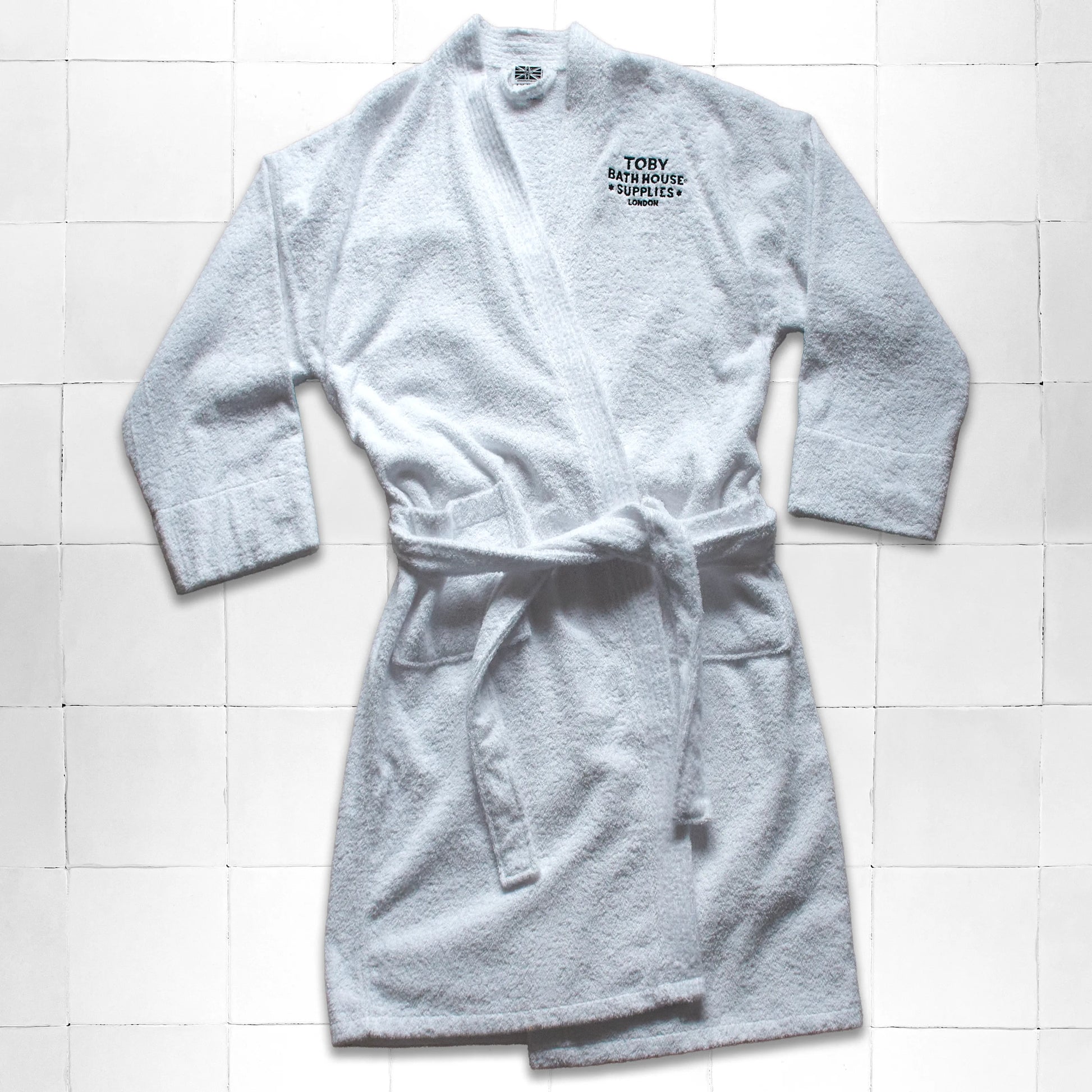 Kimono style towelling white bath robe embroidered with the TBHS block logo in black on the chest. Made from 100% cotton terry with deep patch pockets and belt. Ideal for pre or post sauna comfort.