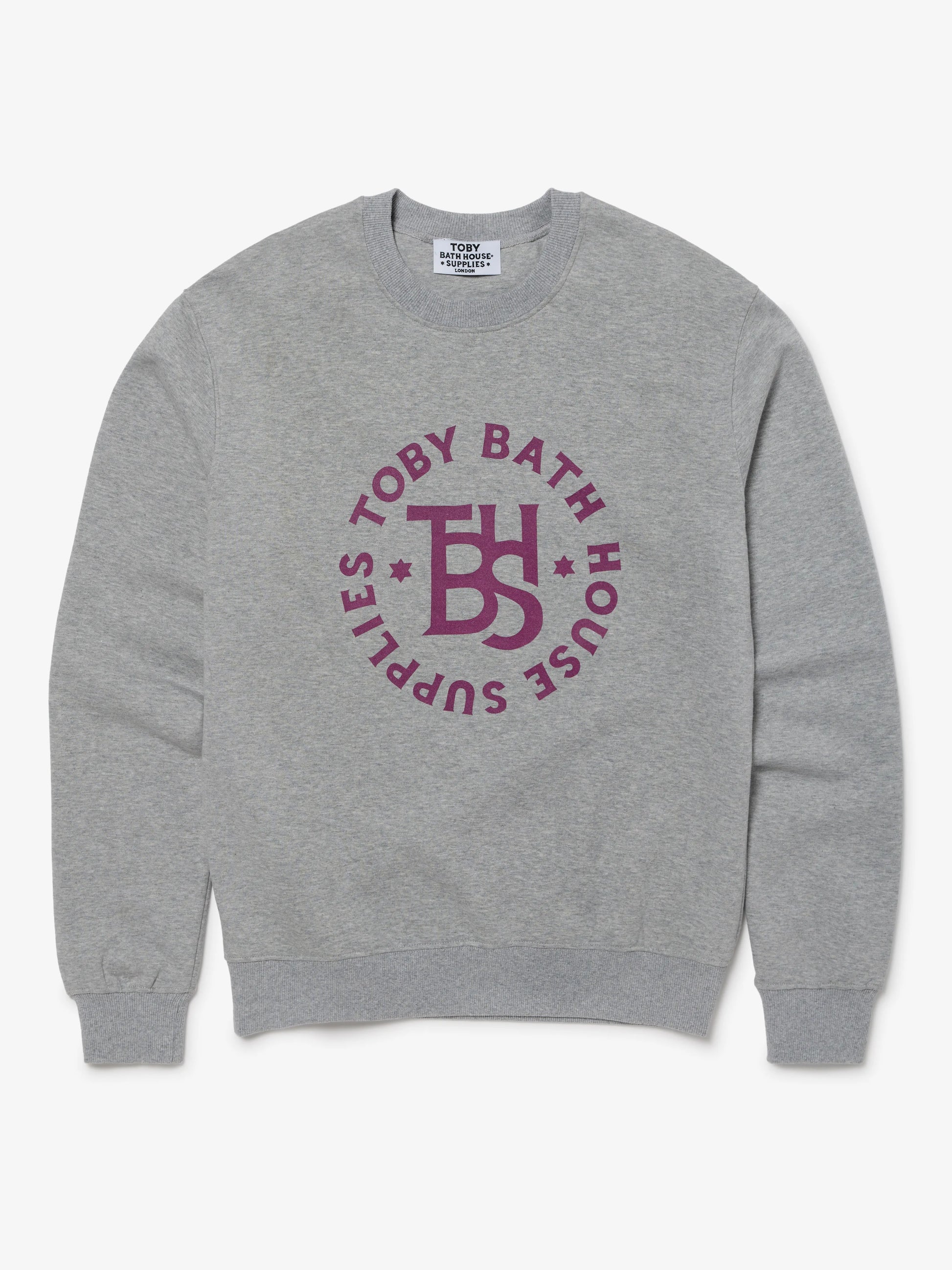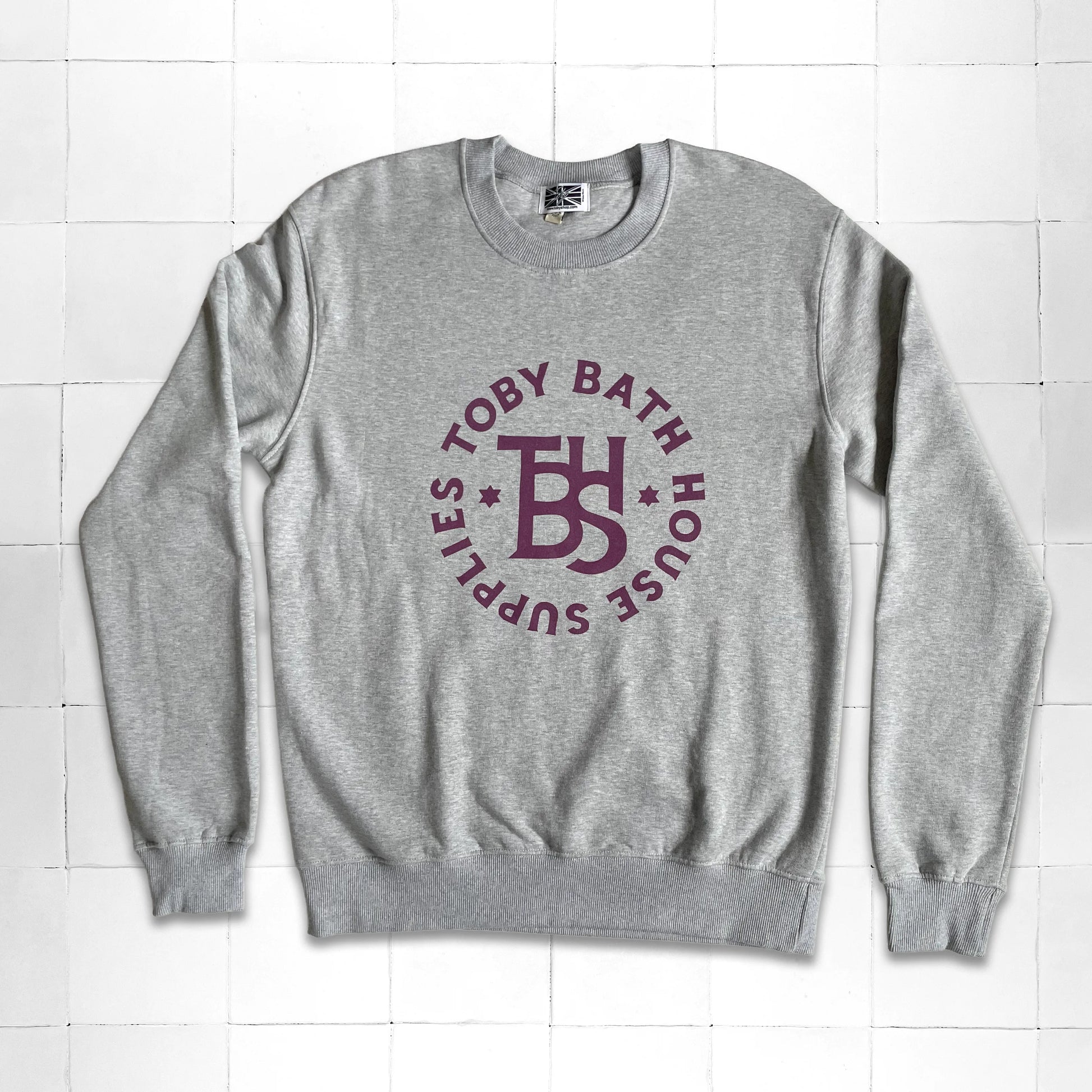 Crewneck sweatshirt in Light Heather Grey, featuring the TBHS monogram logo printed on the front in burgundy.